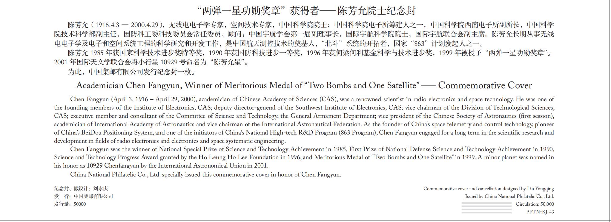 陈芳允(1916.4.3 — 2000.4.29),无线电电子学专家,空间技术专家,中国科学院院士;中国科学院电子所筹建人之一,中国科学院西南电子所副所长,中国科学院技术科学部副主任,国防科工委科技委员会常任委员、顾问;中国宇航学会第一届副理事长,国际宇航科学院院士,国际宇航联合会副主席。陈芳允长期从事无线电电子学及电子和空间系统工程的科学研究和开发工作,是中国航天测控技术的奠基人,“斗”系统的开拓者,国家“863”计划发起人之一。 陈芳允 1985 年获国家科学技术进步奖特等奖,1990 年获国防科技进步一等奖,1996 年获何梁何利基金科学与技术进步奖,1999 年被授予“两弹一星功勋奖章”。2001 年国际天文学联合会将小行星 10929 号命名为“陈芳允星”。 为此,中国集邮有限公司发行纪念封一枚。