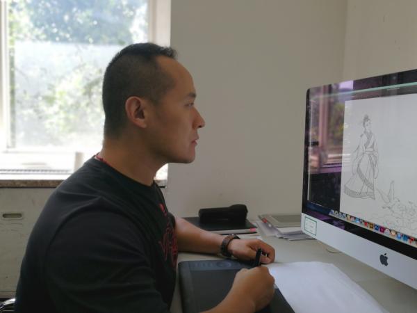 在雕刻创作时,着重体现线条的流畅和人物的表情,刻画时不能过重,要雕刻部分和彩色胶印部分相辅相成,画面中四个人形态各异,分量感不同,头发的走向各异,通过查阅大量白描书书籍及网络上的近代画工笔人物的资料寻找灵感,在创作时刻意加强了画面最前端人物的线条,彰显其体积感和层次感,充分运用了近大远小、近实远虚的创作手法,增强了空间感,并且把每个人的手势也进行了反复推敲,体现出人物的体貌及动态特征。
