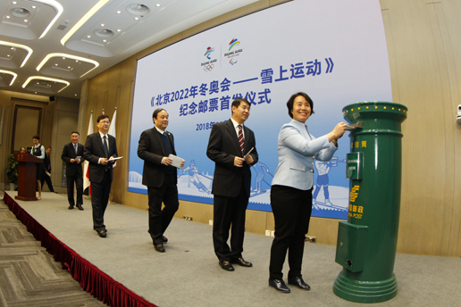2018年11月16日,北京2022年冬奥会和冬残奥会组委会(以下简称北京冬奥组委)与中国邮政集团公司联合举办了“《北京2022年冬奥会——雪上运动》纪念邮票首发仪式”,北京冬奥组委秘书长韩子荣和中国邮政集团公司党组副书记李丕征共同为纪念邮票揭幕。