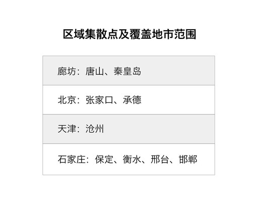 原北京铁路局和京东推进“环京津冀物流一体化”其实都是在打造“大同城”。对邮政来说,实现“大同城”关键在于流程再造。在河北,省内南北互寄邮件传递需要跨省经转,集散经转节点多。不只河北,对三地邮政来说,应协同建成高效、全网畅通的网络。推进网络资源整合,实施业务流程重组和优化,重新构建京津冀区域速递物流网络。邮政网络如何重新构建,如何打破区划界限?于3月1日起启动的京津冀区域互寄标准快递和快递包裹邮件提速工作给出了答案。“从地理位置上看,廊坊是京津冀的中心,在这里设邮政处理中心绝对是最合理的。京津冀区域陆运网以廊坊为区域集散点,北京、天津、石家庄为辅助集散点。”中国邮政指挥调度中心边景春说。廊坊、北京、天津、石家庄4个集散点负责各自覆盖范围内的地市进出口邮件的集散功能,将京津冀区域划分为4个分区。分区内部互寄邮件主要以分区集散点进行集散,跨分区邮件以廊坊为集散点(见图表2),不固守现有行政区划以及作业组织,廊坊中心局的功能被凸显出来。该中心局是京津冀区域互寄邮件的集散中心,同时,还承担京津冀区域省际进出口邮件集散中心和廊坊地市本口进出邮件作业处理中心的功能,实现邮件最短路径的快速经转。