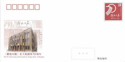 中国邮政定于2019年5月28日发行《<解放日报>在上海创刊70周年》纪念邮资信封1套1枚。详情如下: