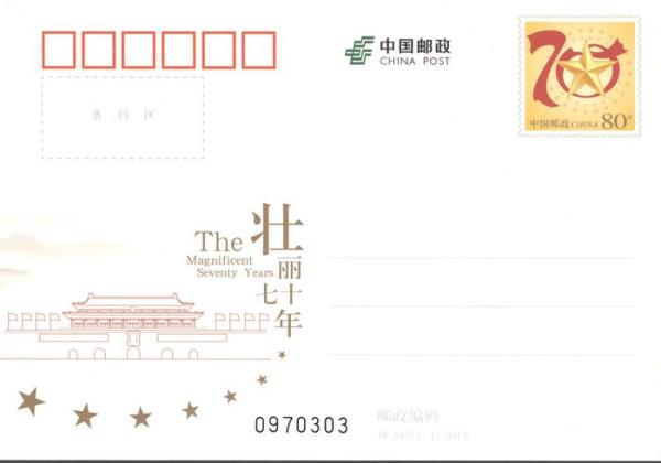 中国邮政定于2019年5月26日发行《壮丽七十年》纪念邮资明信片1套1枚。详情如下: