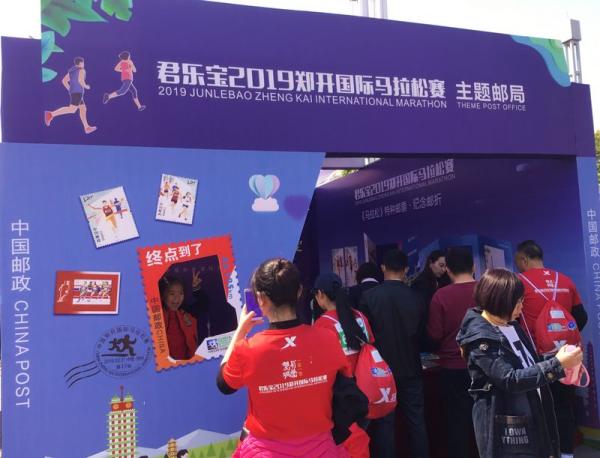 当天上午,在郑州郑东新区CBD商务内环还举办了5千米小马拉松赛(迷你马拉松、亲子马拉松及情侣马拉松)。郑州邮政在其终点设立了“2019郑开国际马拉松赛主题邮局”(见图),供应邮折、封片及书签等创意产品,并启用了“第13届中国郑开国际马拉松赛”纪念邮戳;设置“终点到了”邮票形相框,供参赛运动员和游客体验一把终点冲刺的兴奋心情。