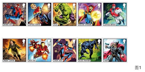 这套邮票由10枚邮票以及1张内含5枚邮票的小全张组成。10枚邮票以漫威宇宙中著名的超级英雄人物作为主题(图1),图案包括蜘蛛侠、绿巨人、雷神、钢铁侠、奇异博士、惊奇队长、黑豹、佩吉·卡特这些人气较高的超级英雄或关键人物,同时也有两位知名度不是很高,但具有英国背景的超级英雄——英国队长和米字旗。