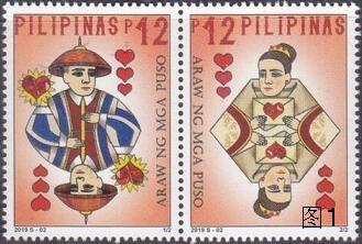2月1日,菲律宾邮政为本年度的情人节(即圣瓦伦丁节,每年的2月14日)以小版张的形式发行纪念邮票1套2枚(图1),以胶平版印制,图案设计灵感来自扑克牌,表现的是国王牌与王后牌各一张,国王与王后均身着菲律宾传统服饰,国王一只手托着一颗发光的红心,而王后则双手握着一封以红心封缄的情书,牌面左上角与右下角均有三颗红心;小版张内含邮票4套8枚,边纸图案为深浅色的方块;配发有首日封1枚,封图为由红心与黄点组成的四叶草及深浅色的方块,发行首日纪念邮戳的图案为飞翔的爱神丘比特与七颗心。