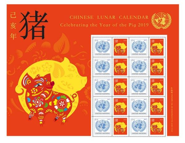 联合国的猪年小版张继续采用喜庆的大红色为背景。黑色的宋体中文“猪”字与黄色的中文宋体字“己亥年”为伴。英文“中国农历”置于小版张上方, 第二行英文是“庆祝猪年2019”, 联合国会徽位居小版张右上角。小版张含10枚联合国会徽普通邮票,邮票面值按美国的国际邮资设定,为1.15美元,小版张售价14.95美元 。
