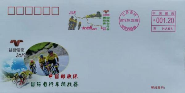 “丝路信使”国际自行车挑战赛是由江苏省泰州市体育局倡议,并于2017年设立的亚洲里程最长的自行车赛事,每年举办一届。今年7月28日,此项赛事从泰州正式出发,终点为哈萨克斯坦的努尔苏丹,共途经51个城市。为此,泰州邮政分公司于7月28日特发行纪念封1枚,印量2000枚。