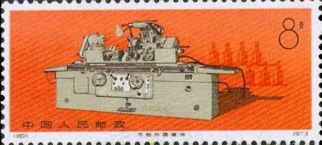 编80,8分,“万能外圆磨床”。图中银灰色机身与澄红色背景相衬。背景中有大型厂房。