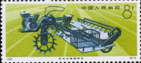 编79,8分,“机动水稻插秧机”。图案背景是一望无际的稻田。主图是机动水稻插秧机。