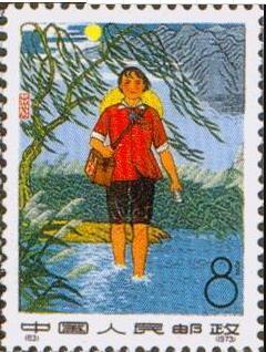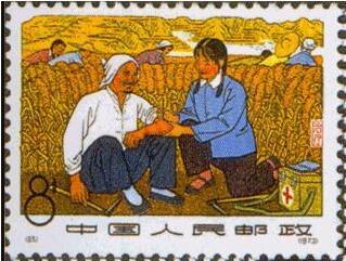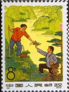 编84,8分,“采草药”。两位女赤脚医生,背着药筐,拿着锄头,正在崇山峻岭间采草药。