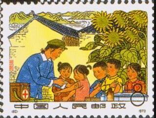 编82,8分,“预防”。一位女赤脚医生在为一群儿童打预防针,背景为向日葵和农家小屋。