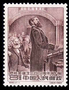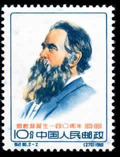 (269) 8分 恩格斯在第一国际海牙代表大会上讲话 640万枚 (270)10分 恩格斯像 250万枚 1960.11.28。P11。26mm×35.5mm。40(10×4)。[G]。(269)雕刻版。(270)影写版。[D]卢天骄。[E]孔绍惠。北京邮票厂。
