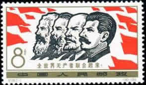 2-1为“马、恩、列、斯”。 主体图案是四位共产主义运动领袖的侧面头像。自左至右依次为:马克思、恩格斯、列宁和斯大林。头像四周红旗如海。