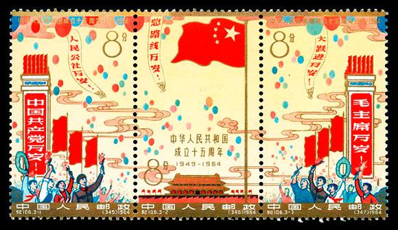 (345)8分,中国共产党万岁,840万枚。 (346)8分,庆祝中华人民共和国成立15周年,630万枚。 (347)8分,毛主席万岁,630万枚。 1964.10.1。影写版。P11.5。31mm×52mm。50(10×5)。横三枚连印。[G]。卢天骄。北京邮票厂。 注:整版中(345)20枚、(346)15枚、(347)15枚。