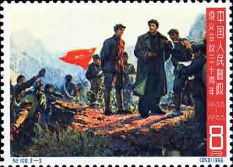第三枚“娄山关大捷”,为毛泽东等登临娄山关指挥作战的情景。娄山关大捷,揭开了遵义战役的序幕,取得了长征以来第一个伟大胜利,充分显示了遵义会议的威力,革命豪情振奋了全军将士。