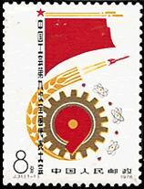 本套邮票共1枚。邮票图案由红旗、齿轮等构成。“中国工会第九次全国代表大会”直列构成旗杆;齿轮中心恰好组成“9”字,象征着这次大会;齿轮象征工人阶级,麦穗、导弹及卫星图案分别象征农业、国防及科技。四种图案又共同寓意四个现代化。作者通过上述象征手法,表现了大会主题。