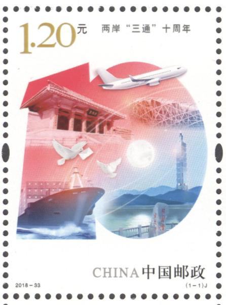 中国邮政定于2018年12月15日发行《两岸“三通”十周年》纪念邮票1套1枚。