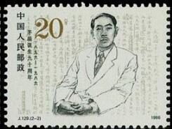 1986.7.4。 影写版。P11*11.5。 40mm*30m。 50(5*10)。 [G]。吴长江。北京邮票厂。 2-1为“茅盾头像”。 2-2为“茅盾的工作像”。画面背景是茅盾的《子夜》手迹。