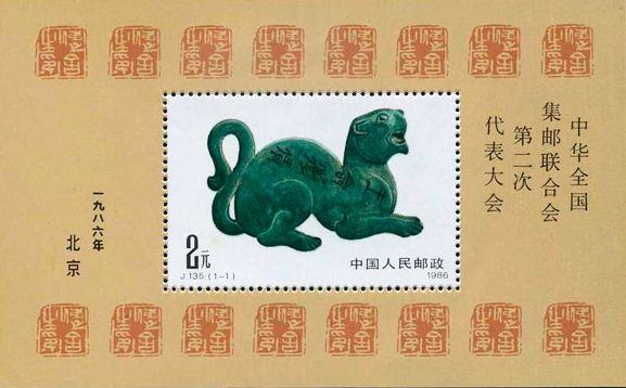 1986.10.17。胶版。P11.5*11。[G]。刘硕仁。北京邮票厂。 小型张规格:130mm*80mm。 邮票规格:60mm*40mm。 中华全国集邮联合会第二次代表大会于1986年 10月17日至21日在北京举行。这次大会审议并通过了新的“中华全国集邮联合会章程”;选举了中华全国集邮联合会第二届理事会和常务理 事会。 小型张采用 故宫博物院收藏的战国邮驿凭证——虎节,装饰则为战国用的封泥印。