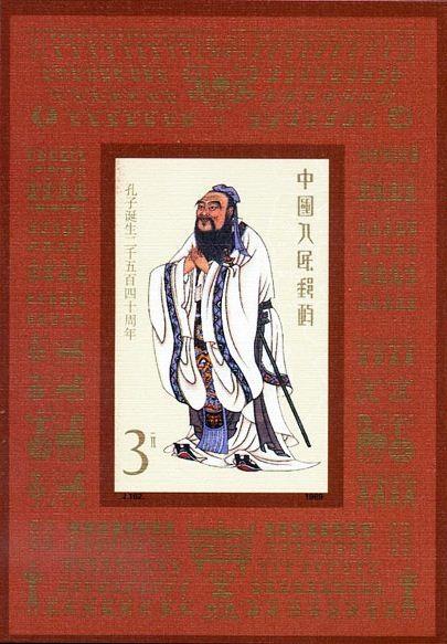 1989.9.28。胶版。无齿孔。小型张规格:74mm*106mm。 邮票图案规格:40mm*60mm。 陈全胜、孙爱国。 北京邮票厂。 小型张画面为“孔子像”,是以唐代吴道子所绘孔子形像为基础,综合孔府收藏的历代所绘孔子像设计而成。边饰图案为古代学校的教学内容中的“六艺”,即礼、乐、射、御、书、数。