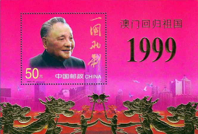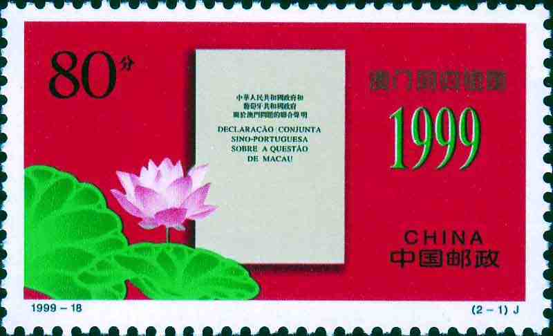 国家邮政局1999年12月20日发行《澳门回归祖国》纪念邮票1套2枚,小型张2枚。