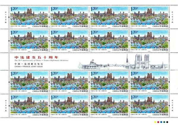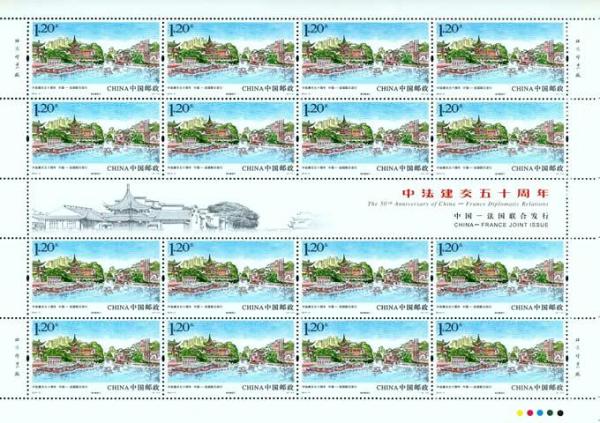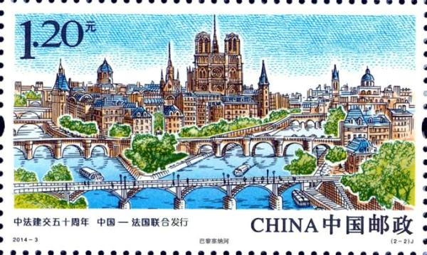 中国邮政2014年1月27日发行《中法建交五十周年》纪念邮票1套2枚(与法国联合发行)。