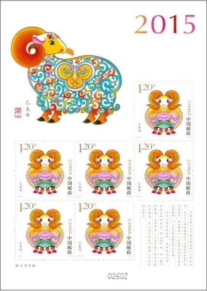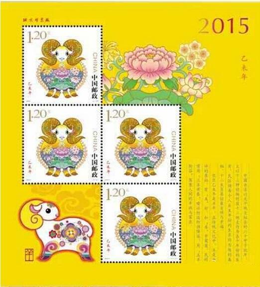 注:同时发行《乙未年》邮票版式三(整张枚数:4枚,整张规格120毫米×130毫米,发行720万版),用于赠送给预订2015年全年纪特邮票的预订户。