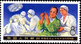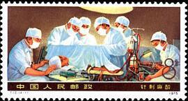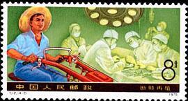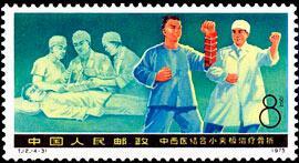 (1) 针刺麻醉 8分 390万枚 (2) 断肢再植 8分 390万枚 (3) 中西医结合小夹板治疗骨折 8分 390万枚 (4) 中西医结合针拨术治疗白内障 8分 390万枚 1976.4.9。影写版。P11.5。58mm×31mm。30(3×10)。[G]。[Ph]夏道陵(1)。[D]孙传哲。北京邮票厂。