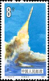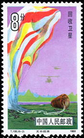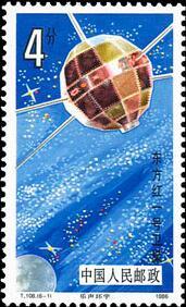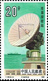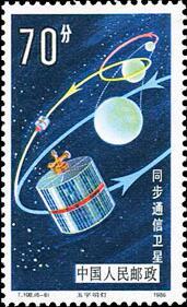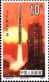 (1) 4分 乐声环宇——东方红一号卫星 2183.96万枚 (2) 8分 天外归来——回收卫星 2413.96万枚 (3) 8分 雷霆海天——潜射火箭 2656.26万枚 (4)10分 腾飞万里——飞向静止轨道 1713.46万枚 (5)20分 天地同音——地面接收站 1753.76万枚 (6)70分 玉宇明灯——同步通信卫星 1155.46万枚 1986.2.1。影写版。P11.5。31mm×52mm。40(10×4)。刘硕仁。北京邮票厂。