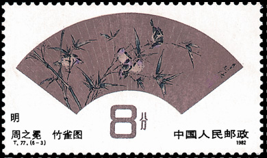 1982年第3届最佳印刷邮票1枚《明、清扇面》第三枚《竹雀图》