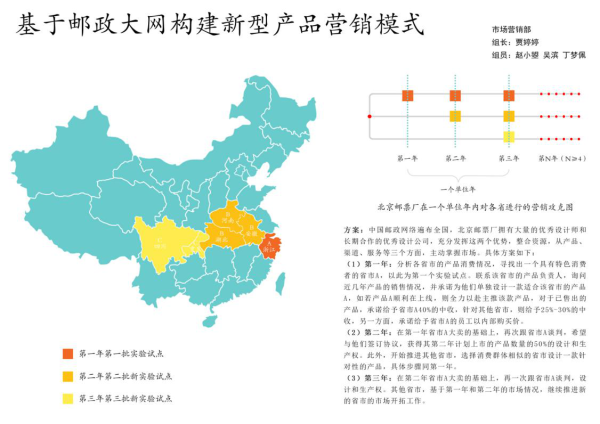 第一年:分析各省市的产品消费情况,寻找出一个具有特色消费者的省市A,以此为第一个实验试点。联系该省市的产品负责人,询问近几年产品的销售情况,并承诺为他们单独设计一款适合该省市的产品a,如若产品a顺利在上线,则全力以赴主推该款产品,对于已售出的产品,承诺给予省市A40%的中收,针对其他省市,则给予25%-30%的中收,另一方面,承诺给予省市A的员工以内部购买价。