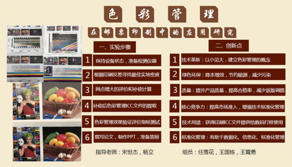 构想:建立一个色彩管理体系的概念,色彩管理是从市场部或邮资票品部对客户样张或设计者样张的印刷质量的把握开始,中间经过生产部和质管部建立的对印刷质量的要求,再到PS调图,数码打样,CTP出版,最后到印刷设备、印刷环境的标准化、纸张和油墨的标准化,所有影响印刷色彩忠实复制的因素,都属于色彩管理的范畴。本实验研究针对印刷设备、CTP出版曲线两个环节,排除影响色彩表达的诸多因素,对色彩数据进行校正,尽可能达到色彩表达的一致性,而不受设备和色空间的影响,保证墨色的一致。