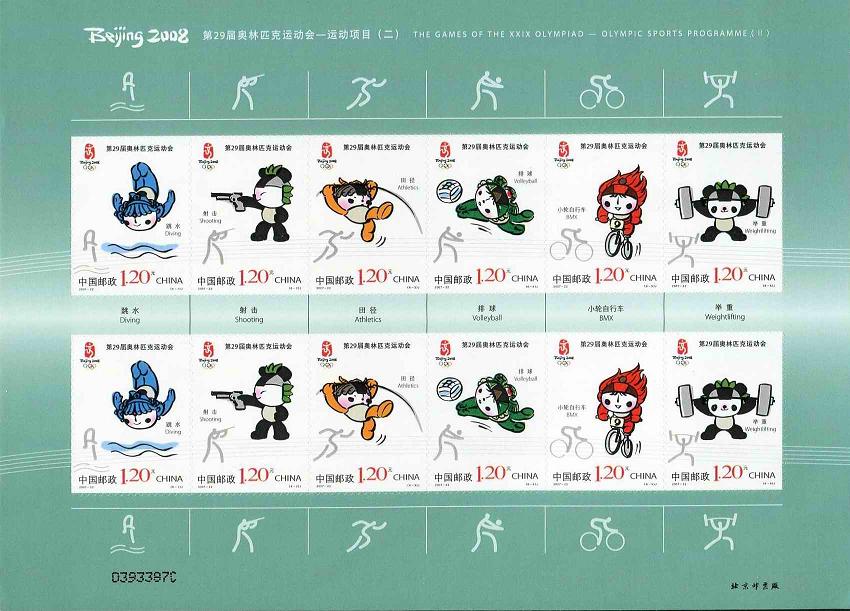 国家邮政局2007年8月8日发行《第29届奥林匹克运动会——运动项目(二)》纪念邮票1套6枚。