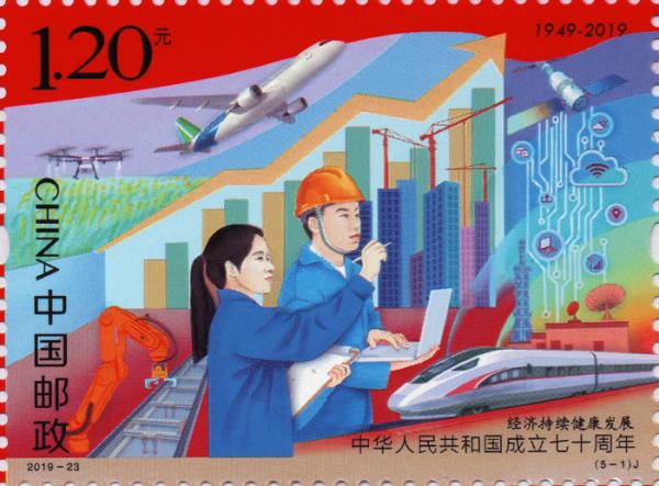 在庆祝新中国成立70周年之际,中国邮政发行《中华人民共和国成立七十周年》纪念邮票,展示祖国在经济、政治、文化、社会、生态文明等方面取得的巨大成就。