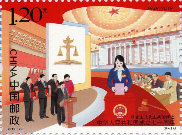 中国邮政定于2019年10月1日发行《中华人民共和国成立七十周年》纪念邮票1套5枚,小型张1枚。邮票图案名称分别为:经济持续健康发展、社会主义民主政治推进、文化繁荣兴盛、人民生活不断改善、建设美丽中国,小型张图案名称为:祝福祖国。全套邮票面值为12元。