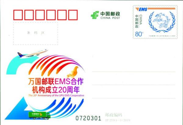 中国邮政于2019年9月10日发行《万国邮联EMS合作机构成立20周年》纪念邮资明信片1套1枚。详情如下: