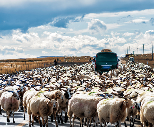哈弄夺机的邮车被羊群“包围”。