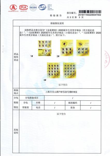 >《金鼠聚财》2020鼠年生肖贺岁邮品(四方连纪念金、小版纪念金、大版纪念金)质检报告