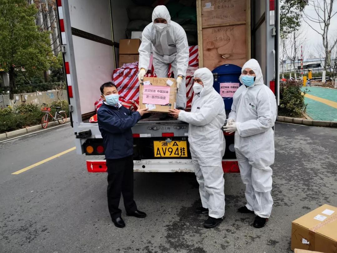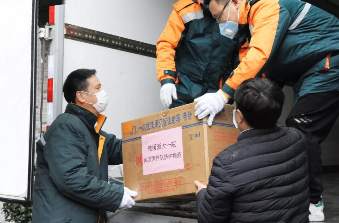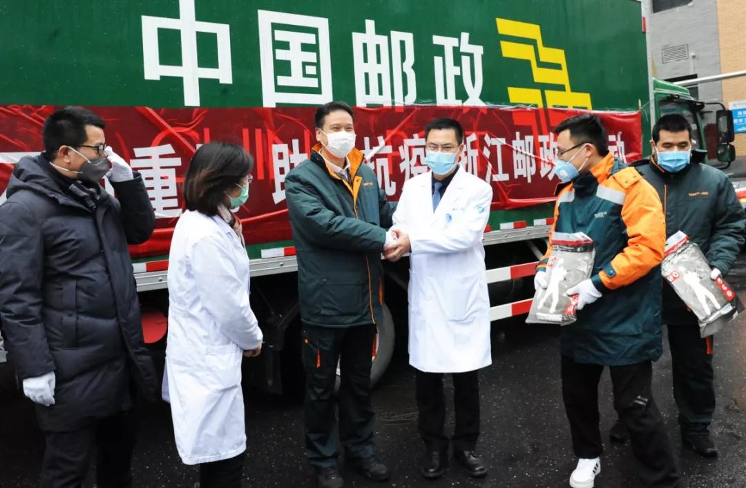 2月6日下午,一辆邮车开进了浙江大学医学院附属第一医院,停在了17号楼前,邮政和医院双方的工作人员冒着淅沥的小雨小心翼翼地将装着医疗耗材的一个个大箱子搬进车厢。浙江省邮政分公司党委书记、总经理陈清,浙大一院常务副院长裘云庆、党委副书记邵浙新均到达了现场。
