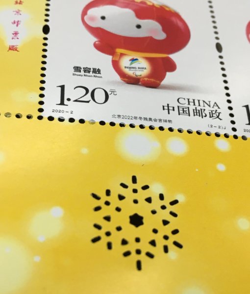 邮票边饰上采用特殊的APS镂空工艺,雪花状的镂空图案具有极佳的防伪性能,使大众更容易识别真伪,并增添了新奇的艺术效果,更加契合冬奥会与冬残奥会的主题。