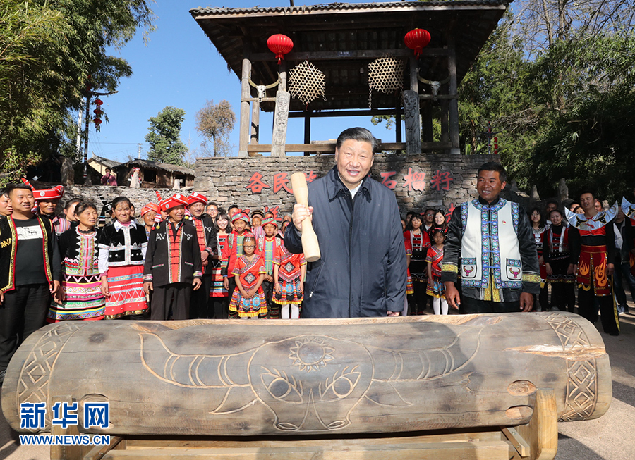 今年1月19日,正在云南考察的习近平来到腾冲市清水乡三家村中寨司莫拉佤族村。司莫拉,佤语意为“幸福的地方”。习近平说,在大家努力下,你们这里已经实现脱贫并正向新的发展目标努力迈进,可喜可贺。全面建成小康社会之后要全面推进乡村振兴,让幸福的佤族村更加幸福!按照当地习俗,习近平拿起鼓棒,敲响三声木鼓,祝福风调雨顺、国泰民安、四海升平,并向乡亲们致以新春祝福。