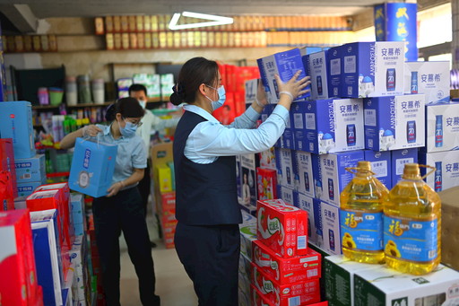 邮政员工在加盟店帮忙上货。