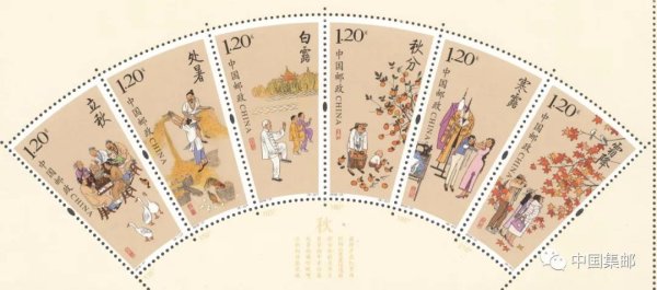 中国邮政曾于2018年8月7日发行过《二十四节气(三)》特种邮票1套6枚,邮票图案名称分别为:立秋、处暑、白露、秋分、寒露、霜降。“立秋”这枚邮票就表现了一家人围坐“贴秋膘”的温馨场景。