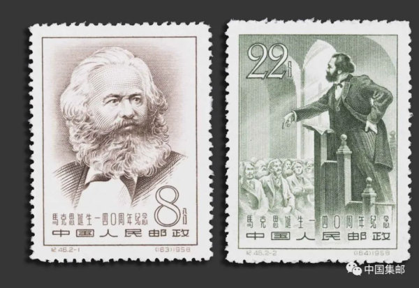 纪46《马克思诞生一四〇周年纪念》邮票发行于1958年5月5日。邮票选自苏联著名版画家尼·尼·茹可夫的《马克思、恩格斯画传》。这套组画共39幅,是画家深入研究历史资料而创作的,他塑造的形象真实感人,赢得广泛赞誉。此套邮票由中国第一位邮票设计家孙传哲设计。第一枚《马克思像》原作于1867年创作。邮票采用雕刻版印制,再现了原画的韵味。蓬松的头发和长髯,构成其鲜明的外貌特征;宽大的前额和传神的眼镜,显示其深邃的思想和智慧。第二枚为《马克思在伦敦德国工人教育协会上讲话》,是马克思从事革命实践活动的真实写照。只见马克思屹立于站台,左手叉腰,右手有力地挥动,像在跟旧世界宣战。台下观众表情凝重、聚精会神,反衬出马克思语言的动人。窗外一道阳光射进来寓意马克思主义真理如阳光照亮工人阶级前行的道路。