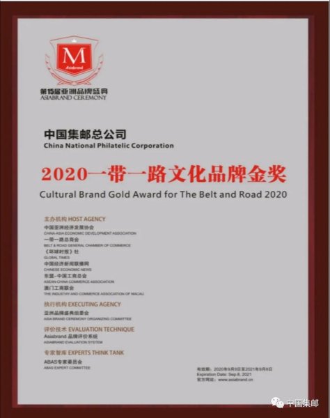 9月9日,“第15届亚洲品牌盛典”在海南自贸港开幕,“2020亚洲品牌500强”榜单同时发布。中国集邮总公司挺进亚洲品牌500强位列第197位,并荣膺“一带一路文化品牌金奖”。