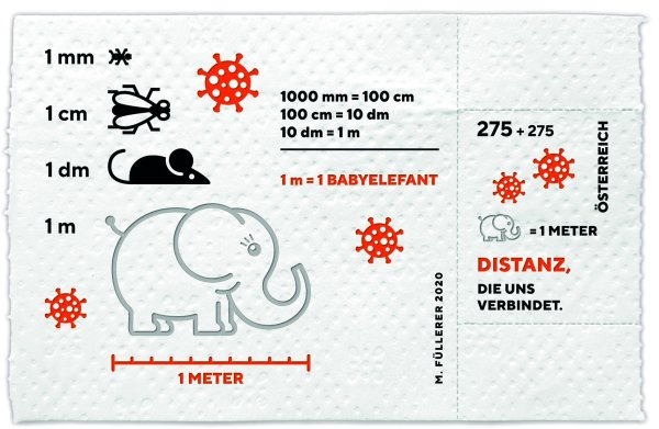 10月30日,奥地利邮政和卫生纸制造商合作创新发行该主题邮票。型张尺寸与一格正常卷纸大小一致,票面印有“让我们聚在一起的距离”的字样,面值为2.75欧元外加2.75欧元的附捐额。在新冠病毒肆虐期间,人与人之间应该保持至少一米的距离来减少疾病的传播,“小象”是为了帮助我们正确判断和保持这一距离。型张上其他不同体型的小动物则直观的体现出不同距离。该票由天然纤维制成,背面粘有自粘箔纸以增强卫生纸的抗撕裂性,并使该票能够更容易的撕开。邮票齿孔采用和卫生卷纸一样的撕口,看上去更加逼真有趣。具有讽刺意味的是该型张创意取自疫情大封锁期间人们疯狂的囤积卫生纸,以这种材质发行抗疫主题邮票也是为了告诫民众保持距离、不要恐慌,要科学应对此次疫情。