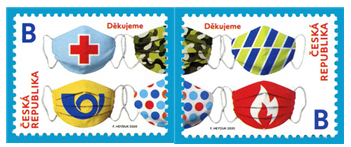 捷克邮政于6月23日发行《感恩救援人员》一套两枚,向奋战在抗疫前线的人员表达热烈感谢,面值为字母“B”(对应捷克国内50克以内邮资,相当于19捷克克朗)。邮票图案由六个紧密相连的口罩组成,代表了所有艰难时期互相帮助、团结在一起的人。左边邮票的口罩图案上印有卫生局、邮局和军队标识,右边邮票的口罩图案上则印有另外半边军队及警局、消防局的标识。自3月初第一个病例出现后,捷克政府下达的几项措施之一就是强制佩戴口罩,从那时起,口罩就成为一种标志,比其他任何东西都能更好地表现当下全民抗疫的状态。