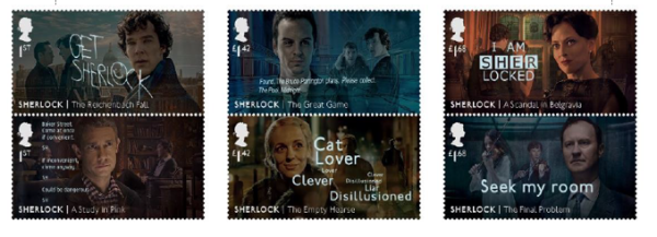 英国皇家邮政从已播出的剧集中选取最受民众欢迎的6个故事发行《神探夏洛克》纪念邮票,每枚邮票都突出呈现一位剧中人物。如图所示从左到右,从上至下,分别是《莱辛巴赫瀑布》和福尔摩斯、《伟大的博弈》和莫里亚蒂、《贝尔格莱维亚丑闻》和艾琳、《连环粉红命案》和华生、《空灵柩》和玛丽、《最后一案》和麦考夫。其中《贝尔格莱维亚丑闻》改编自《波希米亚丑闻》,《连环粉红命案》改编自《血字的研究》,《空灵柩》改编自《空屋》,无一不是向原著致敬。这套邮票在紫外线灯下会显现神秘故事情节中隐藏的细节,让不少剧迷直呼“心动”。