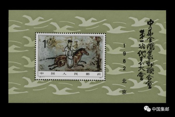 中华全国集邮联合会第一次代表大会于1982年8月25日在北京人民大会堂开幕。邮电部发行小型张1枚。票面以甘肃嘉峪关魏晋墓出图的彩绘《驿使图》壁画为主图案,以雁阵为边饰。该图客观真实地记录了距今1600多年前这一地区的邮驿情形,被认为是我国发现最早的古代邮驿的形象资料,也表明我国是世界上最早建立邮驿的国家之一。特别是传说图中的驿使脸上五官独独缺少了嘴巴,意在表明昔日驿传的保密性。1994年起,邮政储汇局开始发行邮政储蓄绿卡,并将《驿使图》作为卡面主要形象。其后这一图案元素多次登上纪特邮票。