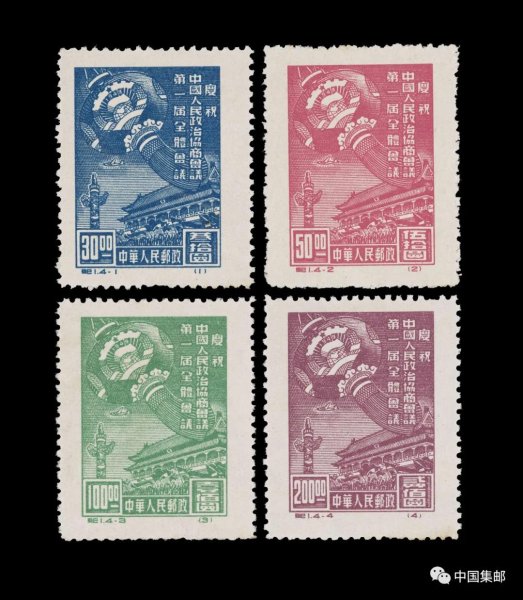 1949年9月21日~30日,中国人民政治协商会议在北平举行了第一届全体会议。1949年10月8日,为庆祝中国人民政治协商会议第一届全体会议胜利召开,华北邮政总局以“中华人民邮政”名义向全国发行一套《庆祝中国人民政治协商会议第一届全体会议》纪念邮票。这是新中国成立后发行的第一套邮票。